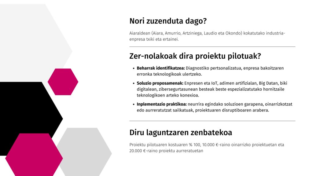 Aiaraldeko enpresen berrikuntzaren eta eraldaketa digitalaren aldeko apustua egiten jarraitzen dugu Aiara Industrial Laben. Horregatik, Aiaraldea Digitala programa abiarazi dugu: Eraldaketa digitaleko proiektu pilotuak, aukera paregabea eskualdeko ETE industrialentzat, teknologiaren bidez lehiakortasuna hobetu nahi dutenentzat.